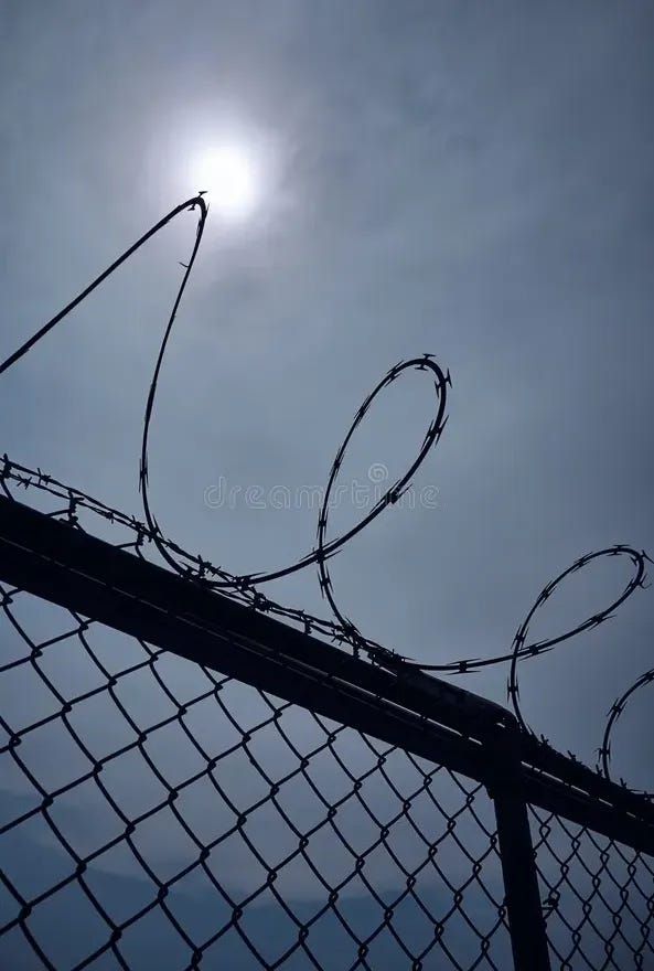 One night, I looked up from the yard and saw the moon trapped in loops of razor wire. It was almost beautiful — the kind of beauty only prison can twist.